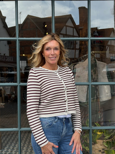 This cardigan from Oui offers a contemporary spin on the classic stripe design with a softly textured finish and subtle three-dimensional effect. The knit has a straight cut and is slightly cropped with signature emblem buttons adding a polished touch. The cardigan has discreet shoulder pads, creating a defined silhouette. Wear with jeans for a casual feel or team with tailored trousers for a more formal look.