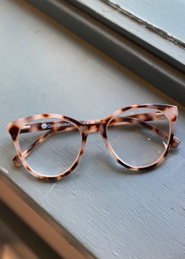 Oversized slightly cats-eye frame in white tortoiseshell. Complete with sprung hinges for extra comfort and a matching Goodlookers carry case.