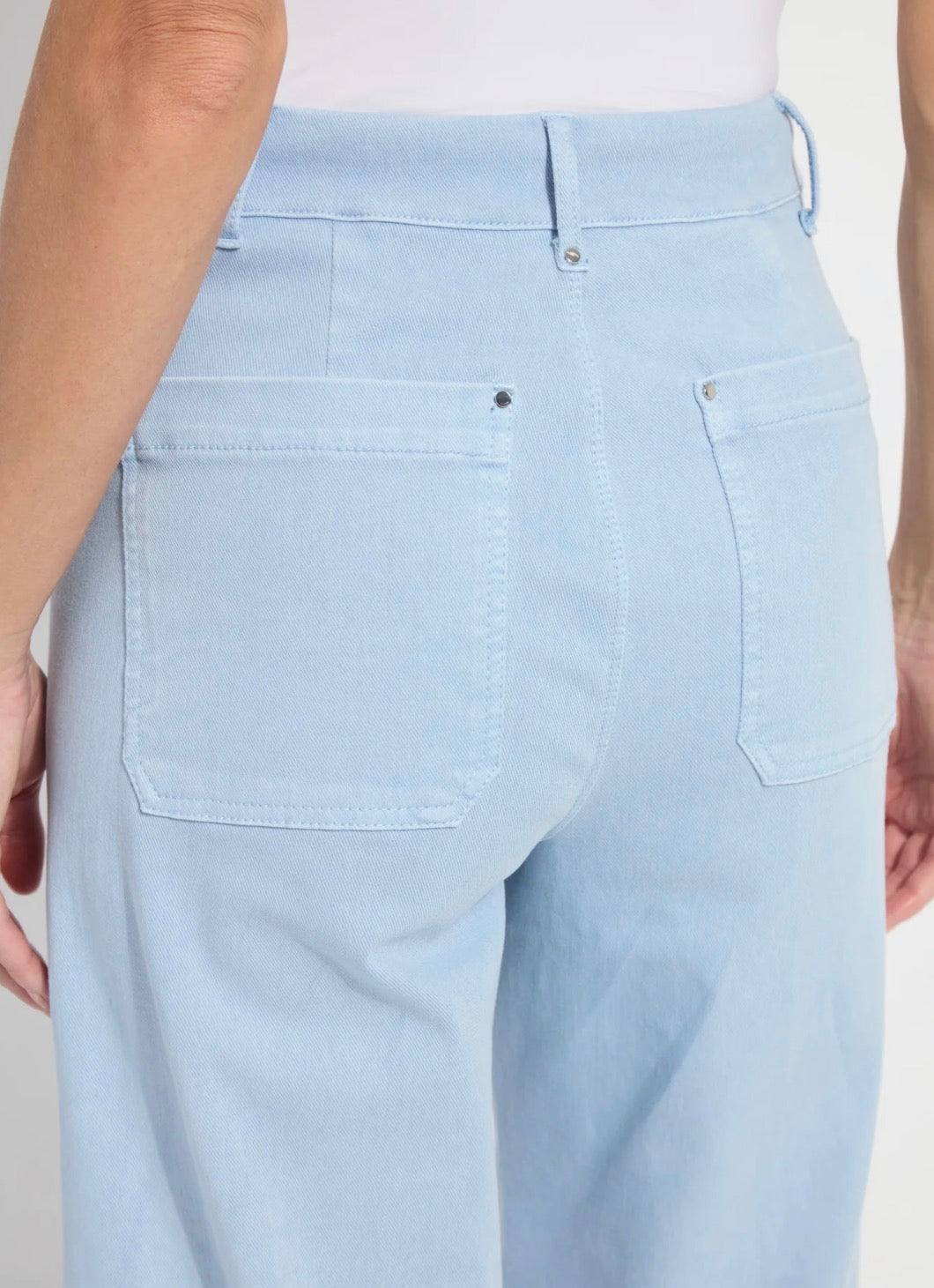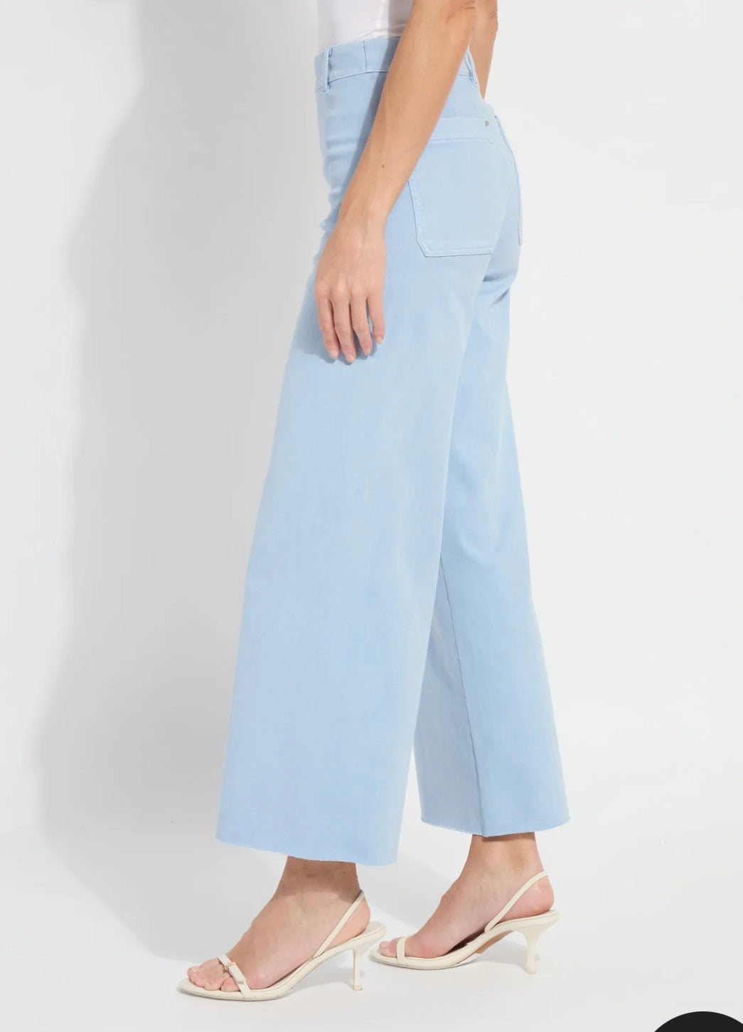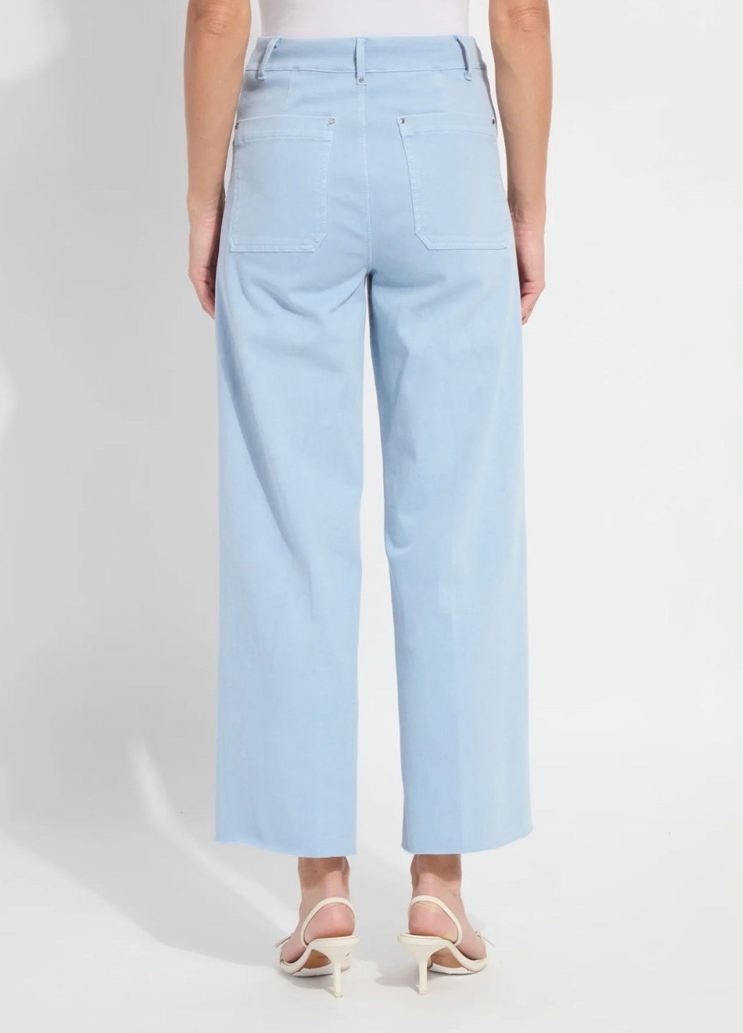 This style is a high waisted, wide leg ankle grazer with an unfinished hem style and pockets at the back produced in an antique wash - chalk blue. The inside leg measures 28".