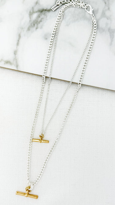 Silver multi chain T-bar long necklace in gold with silver T-bar