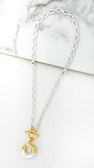 Short necklace with a silver chain, T bar fixing in gold/silver with round pendant