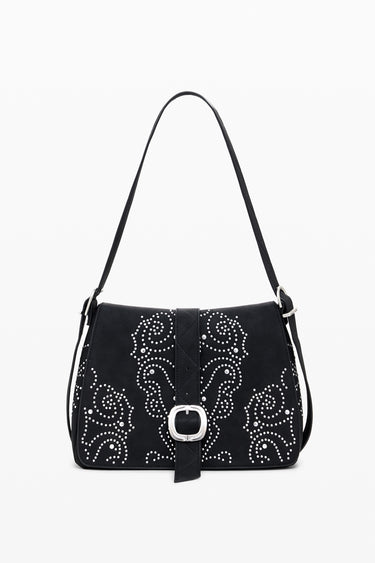 This Western inspired bag from Desigual offers a classic black shoulder bag design with an elevated style. Featuring silver studs throughout with a silver buckle at the front and silver Desigual logo at the back.