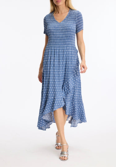 V-Neck Polka Dot Midi Dress - Blue/White