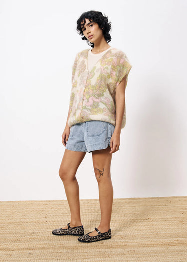Over sized knitted waistcoat in an exclusive FRNCH floral print. Deep V-neck, loose cap sleeves and shell button closure throughout; at the front.