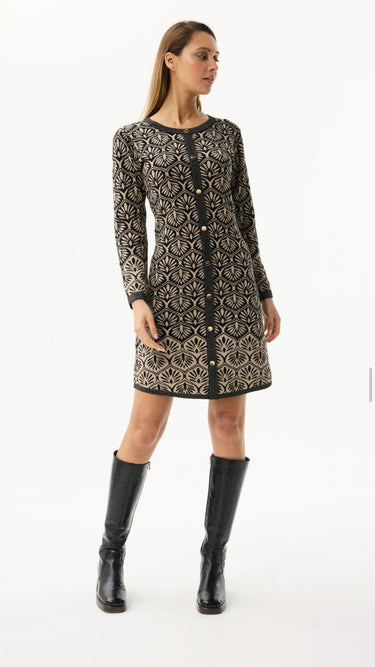 This striking dress from Leo & Ugo is a stand out piece for your autumn/winter wardrobe. Features black base with a damask print offering an art deco feel in gold lurex. Cut to slight A-line the dress is a regular fit with a round neckline and a metallic button front throughout, long sleeves, ribbed cuffs and a ribbed hemline.
