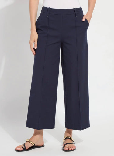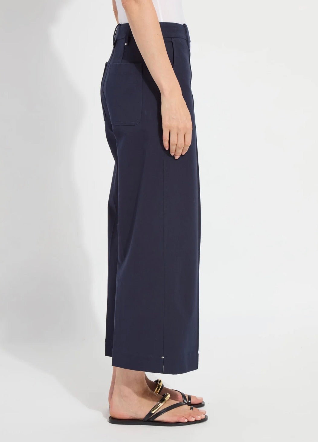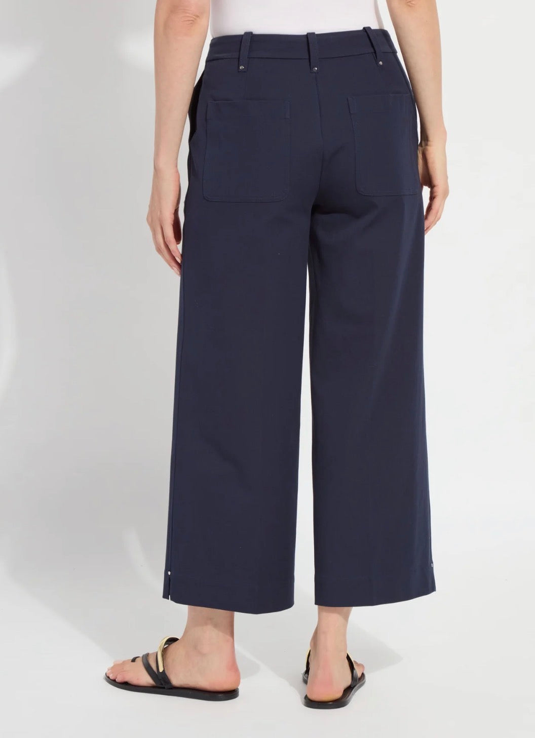 This style is a stretch-twill trouser with cropped wide legs and stud detailing. Features front slant pockets and back patch pockets. The inside leg measurement is 26".