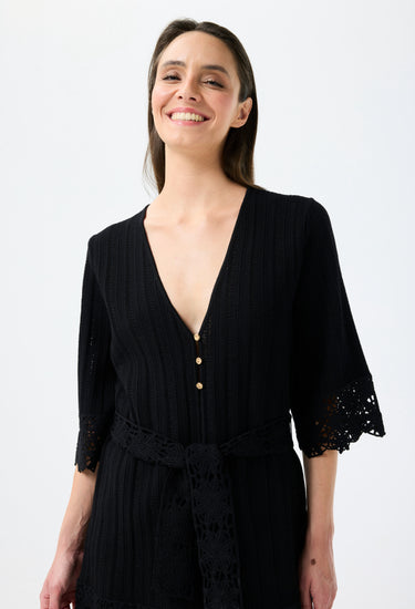 Knitted tunic, thigh length with open work crochet belt. Deep V-neck collar with split front and gold button fastening. Crochet detail also on three quarter length sleeves and hem. A versatile piece that can be dressed up or down or styled as beachwear.