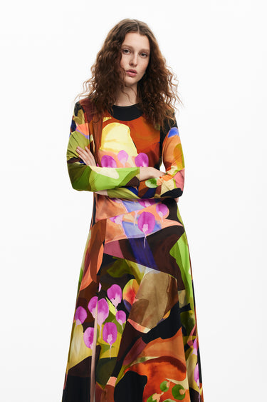 Abstract print midi dress with split at the side of the front. Round neck and long sleeves.