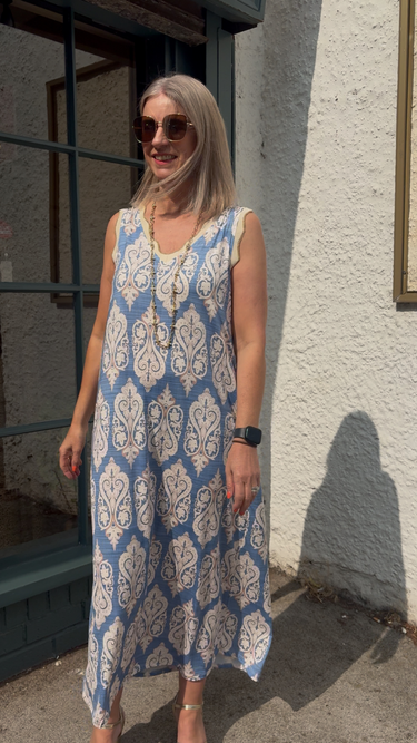 Antique Print Midi Dress - Blue/Cream