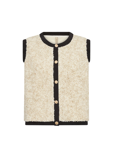 The Bessie Waistcoat from Soya Concept is a beautiful piece for your spring wardrobe. Features a loop knit finish on the outside with a thin fleece lining. Gorgeous knit contrasting trim in black with full front gold button closure.