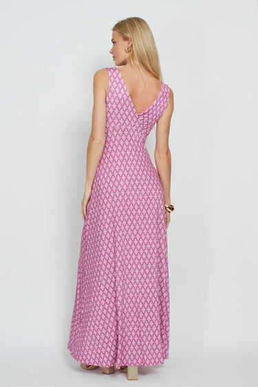Maxi dress in a stretch fabric, all over white diamond pattern with a deep pink base colour. Deep cut v-neckline that is double lined at the chest for support and comfort, the v shape is mirrored on the back. Matching necktie included which can be worn in a variety of ways including as a belt to cinch in the waist.