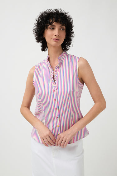 A delicate and feminine vest-style blouse featuring a frill collar that adds a romantic, vintage-inspired touch. The frill collar frames the neckline beautifully, creating a flattering and eye-catching detail. The sleeveless design makes it perfect for warmer weather or for layering under blazers, cardigans, or jackets. The blouse pairs wonderfully with tailored trousers or skirts for a polished outfit, or with light-wash denim for a casual yet chic ensemble. Its balance of structure and softness makes it a versatile piece for both daytime outings and more dressed-up occasions.