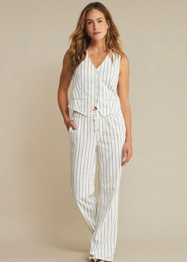 Linen mix, navy pinstripe trouser with elasticated waistband and tie detail at the front. A slightly wide leg fit with an inside leg measurement of 31cm. Front pockets and two faux pockets on the back. Matching waistcoat available, this style is also available in a dark sand pinstripe.