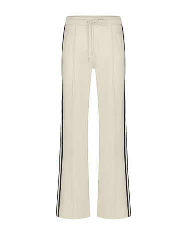 Wide leg casual joggers with contrasting stripe on the outside legs. Elasticated waistband and drawstring closure. Zipped pockets at the side and faux pockets at the back. Top stitched detail on each leg from the waist to the seam.
