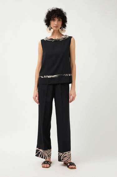A pair of relaxed tailored trousers in black, exuding modern elegance with a unique artistic twist. The trousers are designed with a sleek silhouette, combining the sophistication of tailored pants with the comfort of a relaxed fit. The standout feature is the sand-coloured abstract pattern at the bottom, creating a striking contrast against the deep black fabric. Perfect for a day-to-night transition, these trousers can be styled with a simple blouse or a fitted top for a polished look, or a loose, casual sweater for an effortless outfit. Their bold yet refined design makes them a versatile statement piece in any wardrobe.