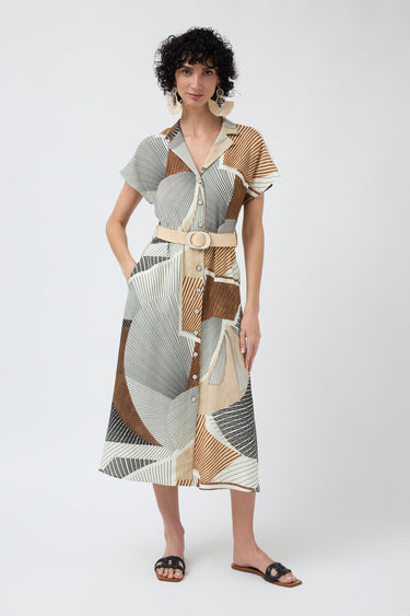 A beautiful linen look, button through midi shirt dress which features a straw effect belt with a brown wooden buckle and a short sleeve.