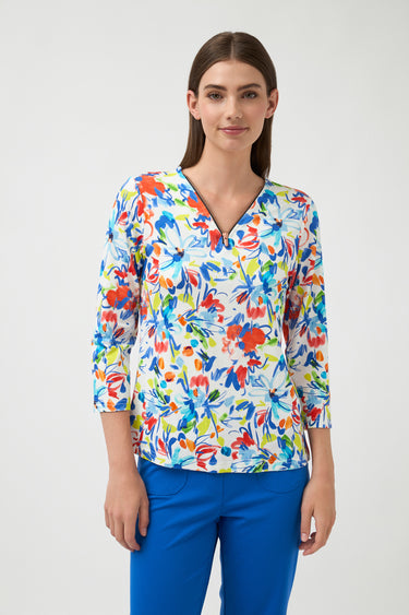 A vibrant long-sleeve V-neck top featuring a crisp white background adorned with playful, colourful splat designs. The V-neckline is gently tapered, offering a flattering silhouette that frames the collarbone elegantly. Made to a regular fit this top combines style and comfort effortlessly. Perfect for casual outings, it pairs well with jeans, shorts, or even skirts for a fun, creative look.