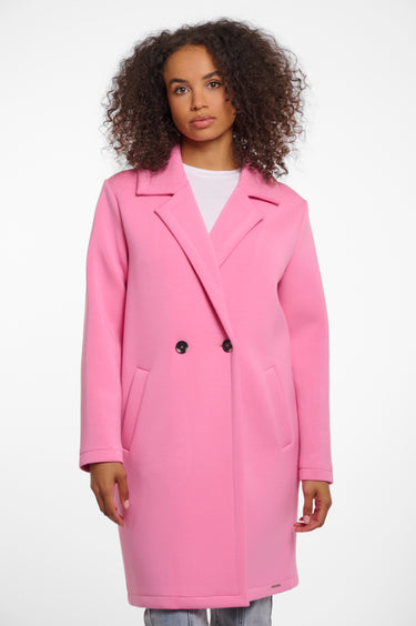 This Double breasted coat in a lightweight scuba material features a classic lapel, slit pockets, button closure and is unlined this will add a pop of colour over any outfit.