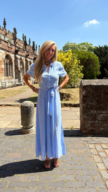 Shirt dress with front button fastening in a light blue and white stripe with a short sleeve and tie belt a timeless piece for the months to come.