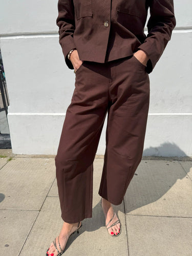 High waisted trousers with balloon-shaped leg in a chocolate colour. On trend with a subtle, balloon-leg that tapers at the ankle, the trousers have side and back pockets. This style is also available in cream and we offer a matching jacket in both cream and chocolate.
