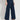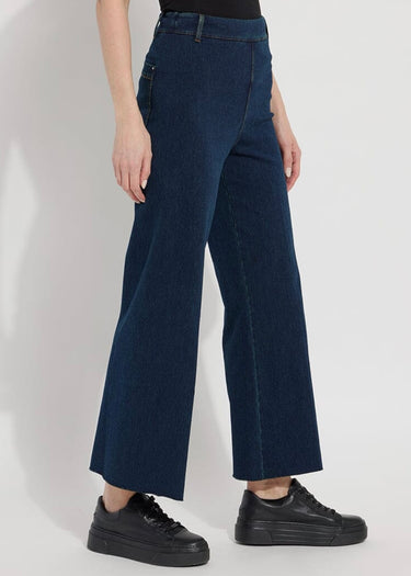 This style is a high waist, ankle grazer with back pockets in a dark wash denim. Also available black and antique pink.