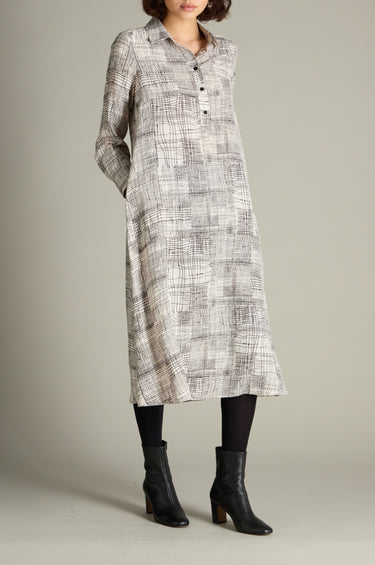 The Etched Check Print dress from Sahara is a versatile piece that is timeless making it a great addition to your wardrobe. Features a classic shirt collar, half button placket and long sleeves with fixed cuffs. The clean-cut upper gently skims the body, flowing into an A-line hem with soft movement. Discreet side seam pockets and black shell buttons complete the piece.
