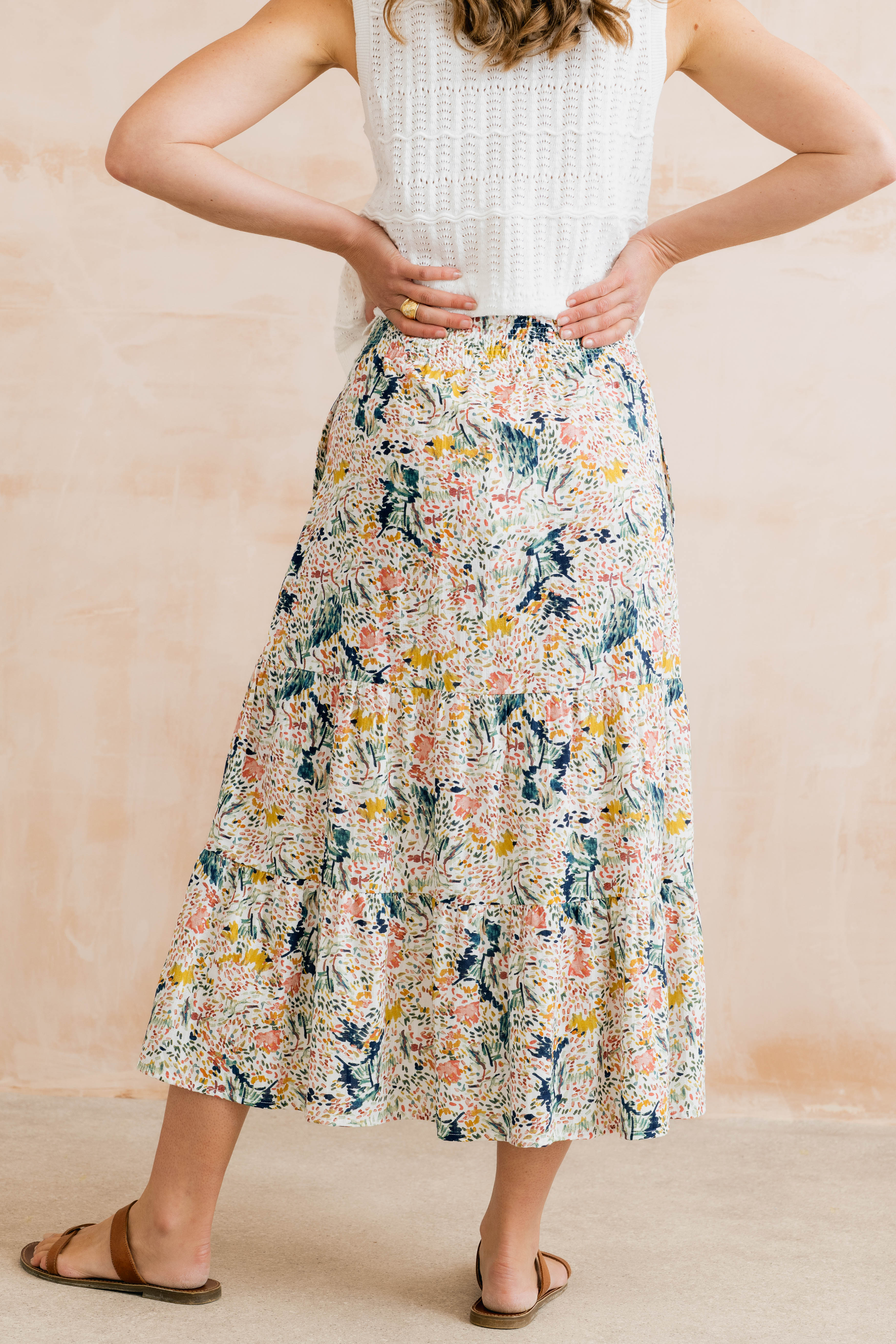 The Evie Midi Skirt from Lily & Me is a beautiful piece for the spring/summer seasons with its elegant cut in light weight fabric and beautiful floral design. Features a flat front with an elasticated back - adding comfort whilst ensuring a great fit.