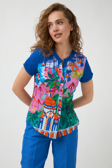 A stylish short-sleeved shirt in a classic navy blue hue, featuring a relaxed v-neckline for a comfortable and contemporary look. The front is adorned with a vibrant beach and house scene, evoking a coastal vibe with artistic charm. Perfect for casual outings or summer vacations, this shirt combines laid-back style with eye-catching detail, making it a versatile addition to any wardrobe.