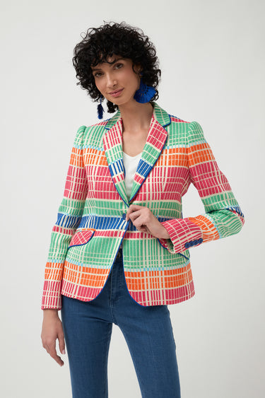 A stylish and relaxed blazer featuring a bold striped pattern that incorporates vibrant hues of red, green, orange, and dark blue. It features classic blazer details like a double-button closure. The mix of bright and deep colours makes this blazer a statement piece that pairs wonderfully with solid-coloured or neutral outfits, such as a white t-shirt and denim jeans or tailored trousers. This blazer is a versatile addition to your wardrobe, perfect for adding a pop of colour and personality to any look.
