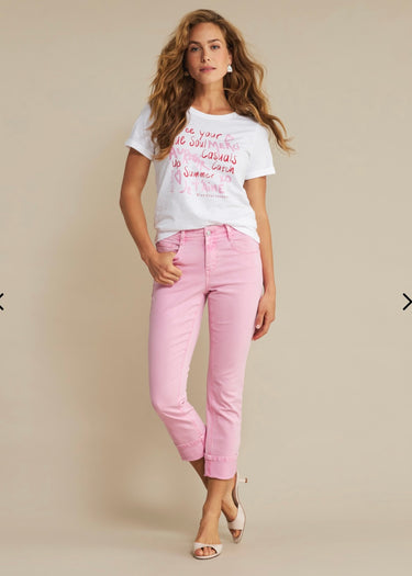 Pastel pink high rise jeans with a straight leg. This style has a turn up cuff but can be worn either way.