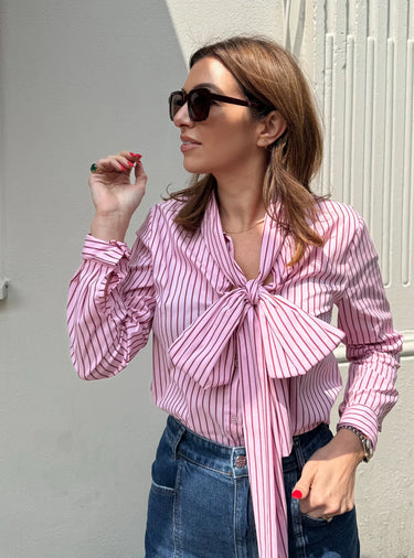 Stripe bow shirt in a soft pink shade with vertical burgundy stripes. This shirt features a statement bow tie neckline with a button front throughout. It is a relaxed style in lightweight material for flexibility and comfort. This shirt comes in 3 different shades in the striped style and it is also available in plain white.