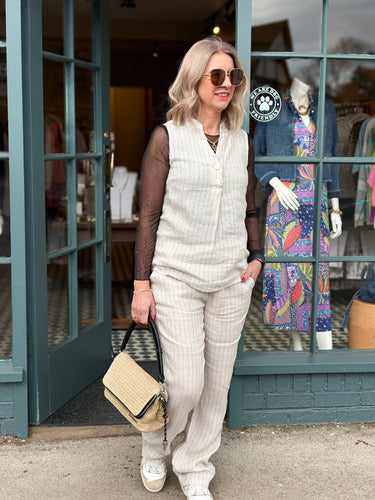 Linen pinstripe trousers, straight leg fit with an elasticated waist and side pockets. Pair with matching tops from D.E.C.K for a coordinated style.