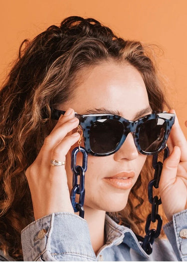 Never lose your glasses again with this fabulous glasses accessory! Combining great functionality with up-to-the minute style, this stunning glasses chain incorporates chunky links in blue with a shiny finish. Strong rubber clasps are suitable for most types of specs, readers, sun-readers and sunglasses. Length - 69cm