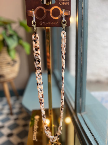 Flat chunky link chain in white tortoiseshell with a shiny finish. Strong rubber clasps are suitable for most types of specs, readers, sun-readers and sunglasses. Length - 69cm