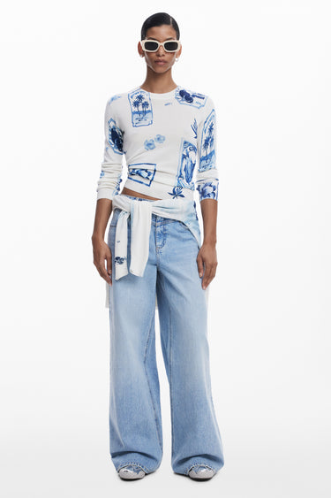 Fine knit jumper with tropical stamp print in blue tones. Round neck with long sleeves, ribbed hem, cuffs and collar.