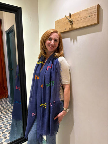 A stand out scarf from Ombrè London in a striking blue with embroidered motifs and whimsical wording. Perfect to add a pop of colour to autumnal tones but also transitions through the seasons and can be worn as a pashmina or beach accessory.