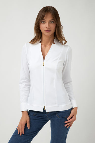 Fitted white shirt made from Organic Cotton. Cotton poplin front combined with stretch back and sleeves for greater comfort and adaptability. Shirt collar with front zip closure. Long sleeves with cuffs and contrasting button closure.