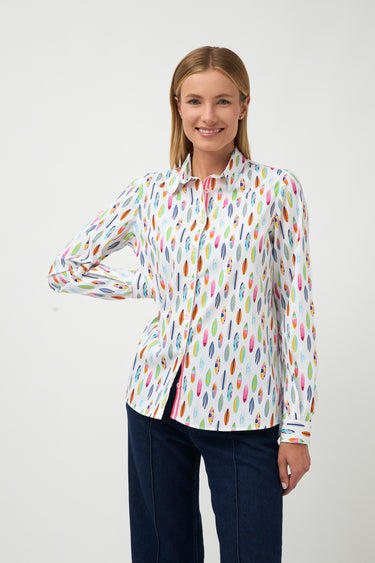 Printed shirt with a shirt collar. Front button closure with pink and white contrasting interior design. Long sleeves with buttoned cuffs. Slightly rounded hem at the back that sits lower than the front.