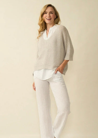 Oversized jumper in an open knit design featuring a v-neckline, 3/4 length sleeve in a relaxed fit, the perfect layering piece.