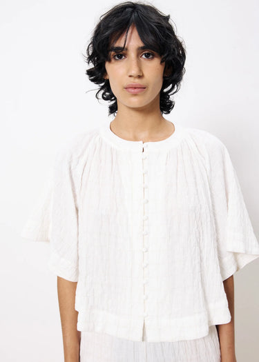 Short sleeved, shirt top in a subtle crinkle effect material with a fine checkered print. Mao collar with button and rouleau loop fastening throughout the front. Wide hem with a slight drop at the back.