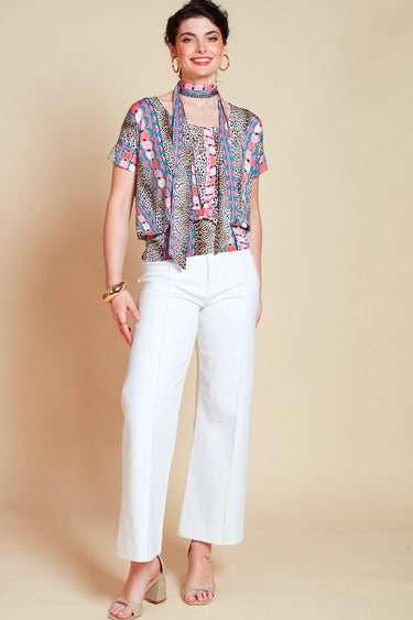 Relaxed fit top in a stretch fabric with a bold mix print. Wide waistband enabling the upper half of the top to drape over the waist, offering a flattering silhouette and a comfortable fit. Matching necktie included which can be worn in a variety of ways.
