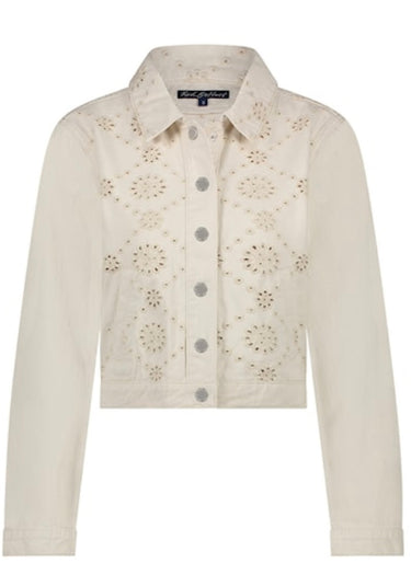Denim style jacket with a broderie anglaise detail on the body leading over to the top of the back. Shirt collar with button closure throughout the front and at the cuffs.