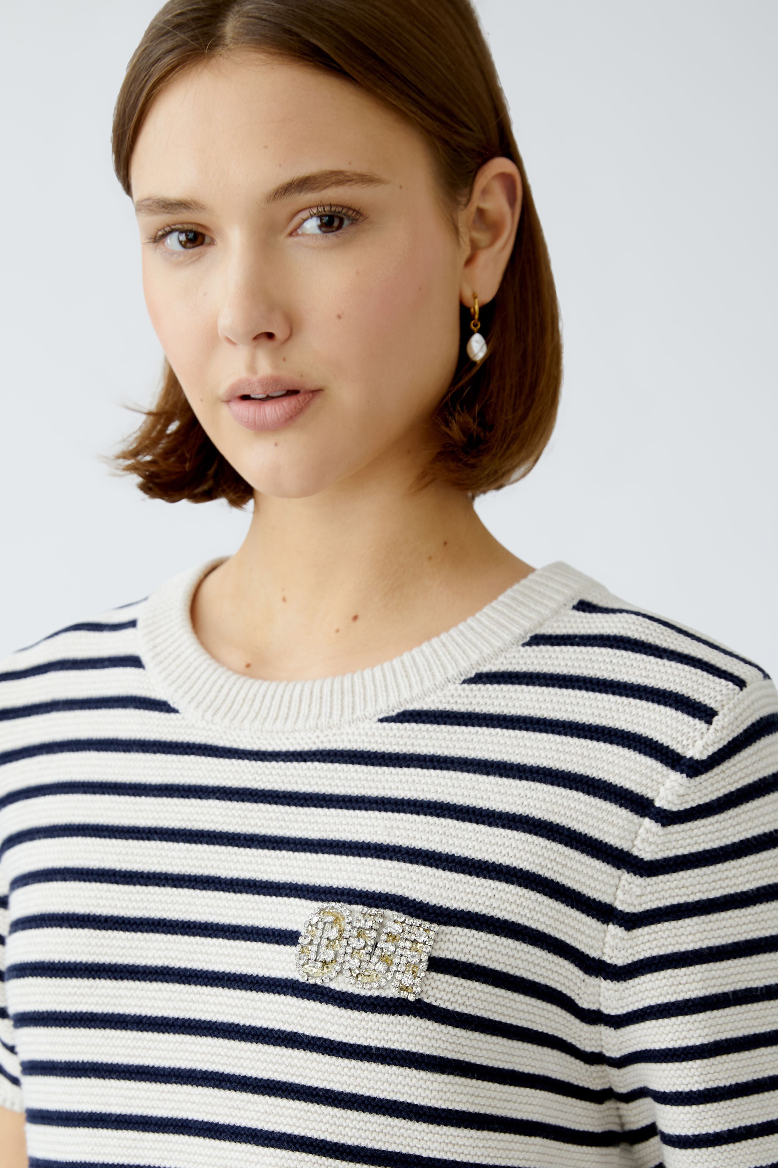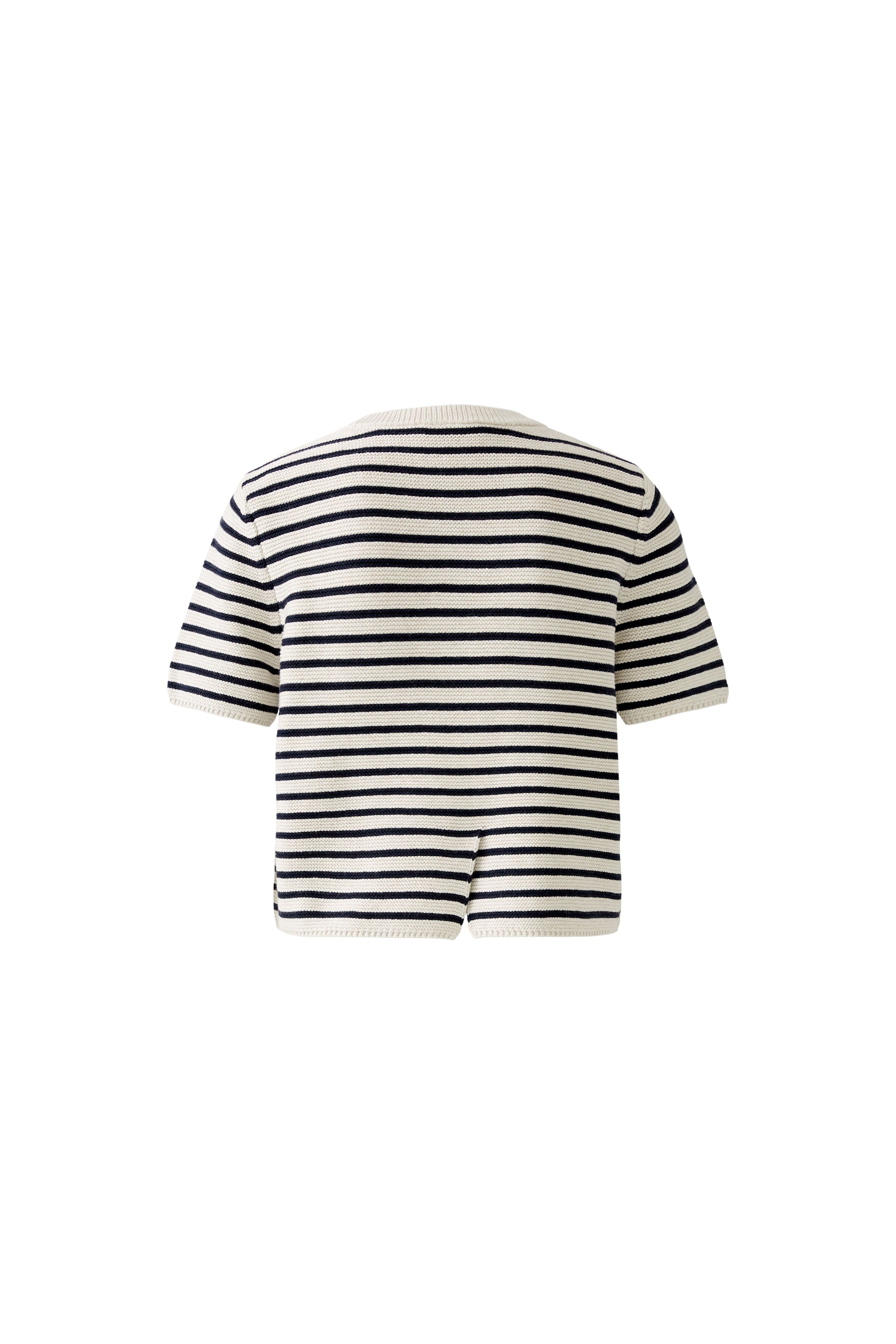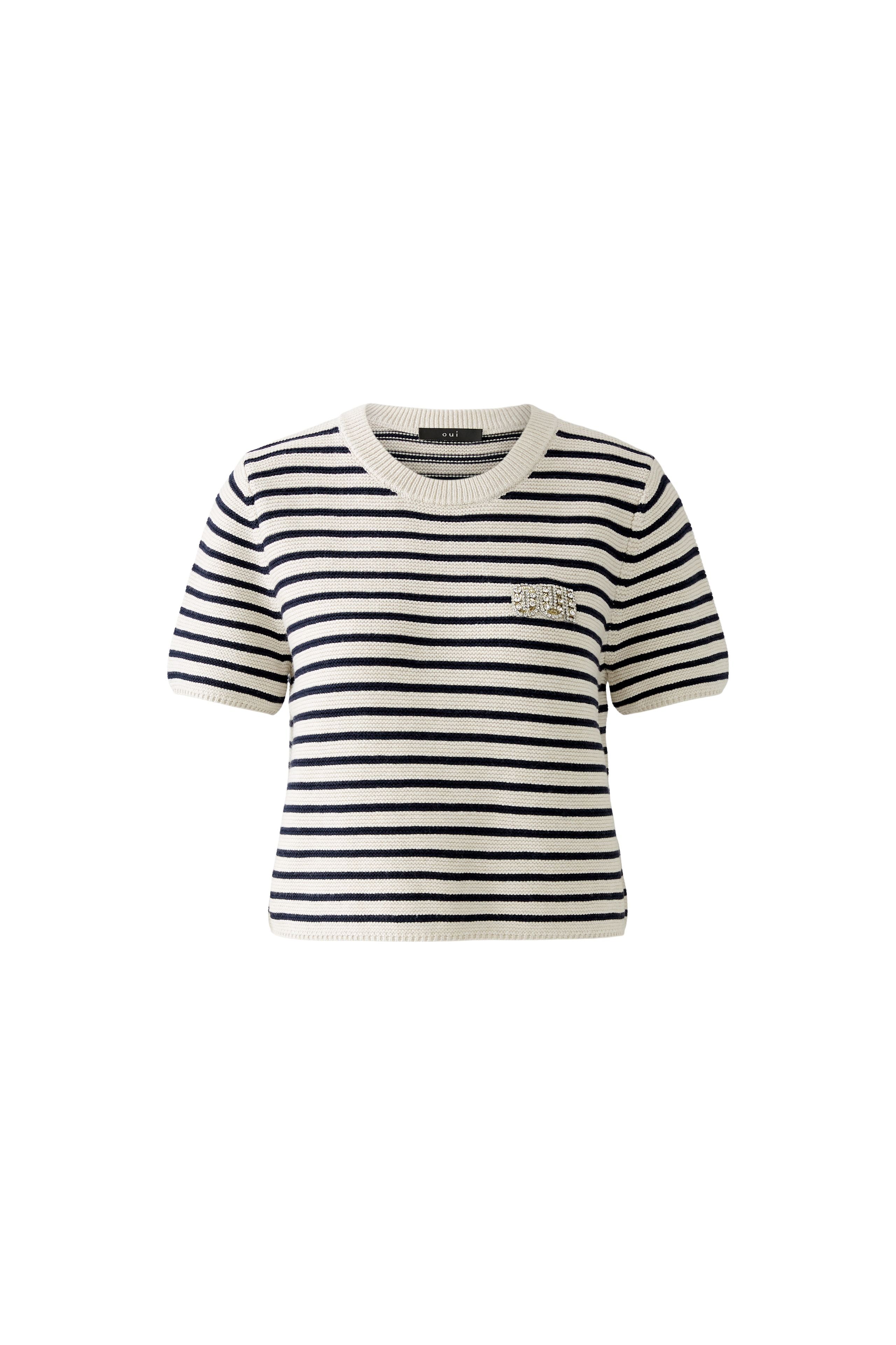 A chic and playful short-sleeve t-shirt jumper featuring timeless blue and white stripes that exude a fresh, nautical-inspired aesthetic. The jumper combines the relaxed fit of a t-shirt with the cozy feel of a sweater, making it ideal for transitional weather or layering. Its slightly cropped length adds a modern touch, perfect for pairing with high-waisted bottoms.
