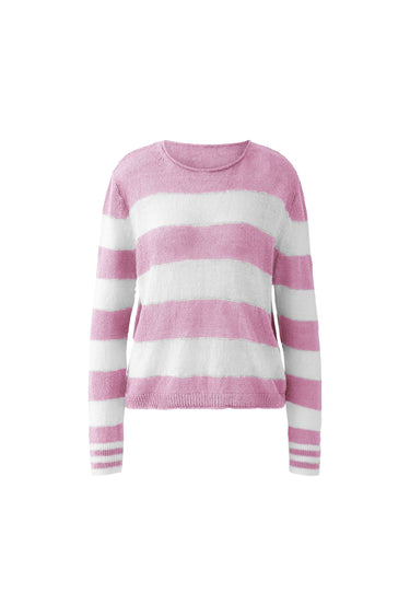 A stylish long-sleeve jumper featuring a timeless white and pink striped pattern, offering a fresh and cheerful aesthetic. It's made to a regular fit, featuring a crew neck and long sleeves for a clean and comfortable fit. This jumper is perfect for layering or a standalone wear, making it a versatile addition to any wardrobe.