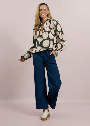 Long sleeve blouse Featuring a round collar with a v-neckline , frill elastic cuff in a beautiful green circle print.