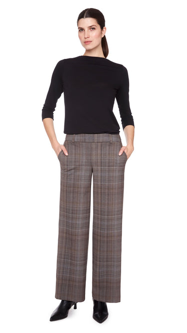 This style is a wide leg full length trouser in a checked pattern. The trousers have pockets at each side and a faux fly at the front with belt loops. The inside leg measures 31".