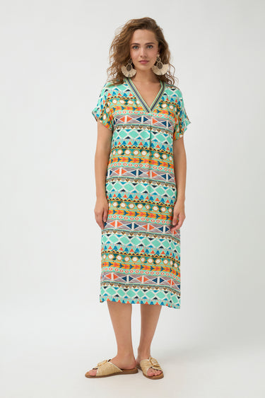 A stunning deep V-neck midi dress featuring a vibrant turquoise pattern, offering a fresh and striking look. The deep V-neckline adds a touch of sophistication and femininity, drawing attention to the collarbone and enhancing the flattering silhouette. The dress flows gently to a midi length, offering both elegance and ease of movement. A slightly oversized fit, perfect for casual outings, evening events, or vacation wear. Pair it with sandals, heels, or ankle boots for a versatile and stylish ensemble.